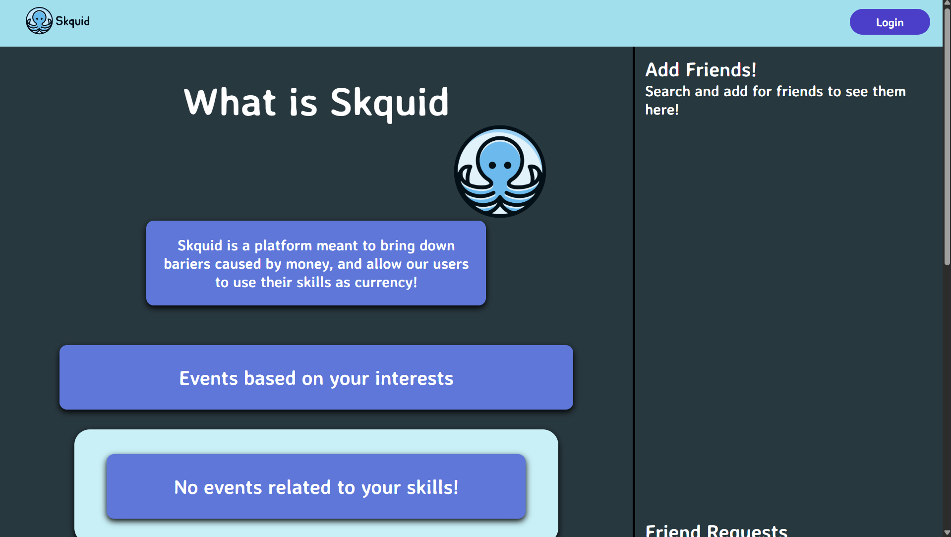 Skquid is a social media web platform that allows users to connect via avenues of event and skill sharing. Users can create accounts and find and chat with other users searchable by skill or other filters. They can also create event groups with other users to meet up with.